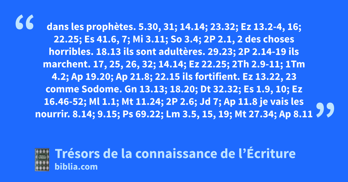 dans les prophètes. 5.30, 31; 14.14; 23.32; Ez 13.2-4, 16; 22.25; Es 41.6, 7; Mi 3.11; So 3.4; 2P 2.1, 2 des choses horribles. 18.13 ils sont adultères. 29.23; 2P 2.14-19 ils marchent. 17, 25, 26, 32; 14.14; Ez 22.25; 2Th 2.9-11; 1Tm 4.2; Ap 19.20; Ap 21.8; 22.15 ils fortifient. Ez 13.22, 23 comme Sodome. Gn 13.13; 18.20; Dt 32.32; Es 1.9, 10; Ez 16.46-52; Ml 1.1; Mt 11.24; 2P 2.6; Jd 7; Ap 11.8