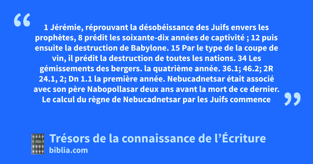 la quatrième année. 36.1; 46.2; 2R 24.1, 2; Dn 1.1 la première année. Nebucadnetsar était associé avec son père Nabopollasar deux ans avant la mort de ce dernier. Le calcul du règne de Nebucadnetsar par les Juifs commence à cette époque ; c’est-à-dire depuis la fin de la troisième année de Jojakim ; et donc, selon eux, la quatrième année de Jojakim était la première de Nebucadnetsar. Mais les Babyloniens font commencer son règne deux ans plus tard, c’est-à-dire à la mort de son père. C’est aussi ce qu’a fait Daniel, qui a écrit en Chaldée.