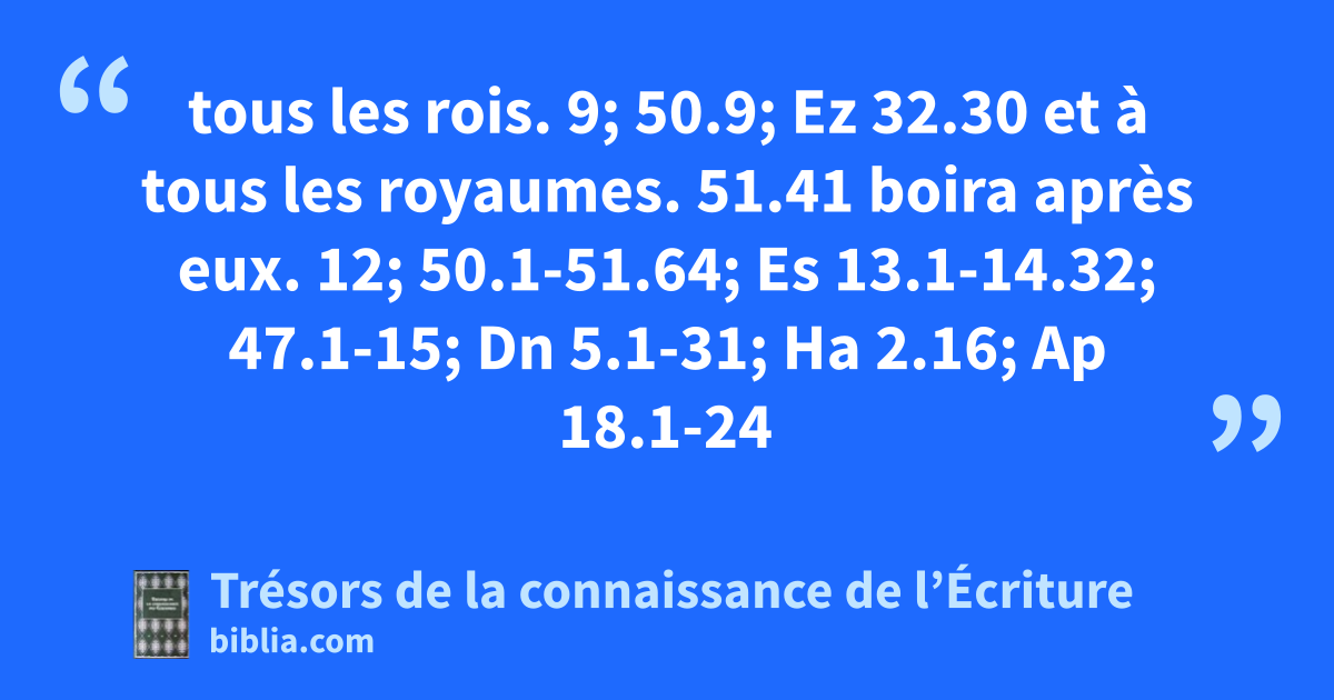 tous les rois. 9; 50.9; Ez 32.30 et à tous les royaumes. 51.41 boira après eux. 12; 50.1-51.64; Es 13.1-14.32; 47.1-15; Dn 5.1-31; Ha 2.16; Ap 18.1-24