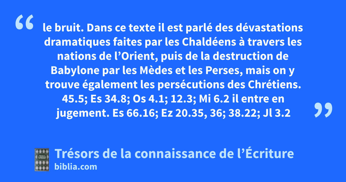 le bruit. Dans ce texte il est parlé des dévastations dramatiques faites par les Chaldéens à travers les nations de l’Orient, puis de la destruction de Babylone par les Mèdes et les Perses, mais on y trouve également les persécutions des Chrétiens. 45.5; Es 34.8; Os 4.1; 12.3; Mi 6.2 il entre en jugement. Es 66.16; Ez 20.35, 36; 38.22; Jl 3.2