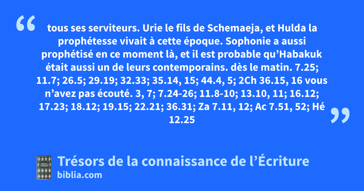 tous ses serviteurs. Urie le fils de Schemaeja, et Hulda la prophétesse vivait à cette époque. Sophonie a aussi prophétisé en ce moment là, et il est probable qu’Habakuk était aussi un de leurs contemporains. dès le matin. 7.25; 11.7; 26.5; 29.19; 32.33; 35.14, 15; 44.4, 5; 2Ch 36.15, 16 vous n’avez pas écouté. 3, 7; 7.24-26; 11.8-10; 13.10, 11; 16.12; 17.23; 18.12; 19.15; 22.21; 36.31; Za 7.11, 12; Ac 7.51, 52; Hé 12.25