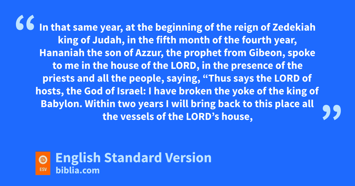 28 In that same year, at the beginning of the reign of nZedekiah king of Judah, in the fifth month of the fourth year, Hananiah the son of oAzzur, the prophet from pGibeon, spoke to me in the house of the Lord, in the presence of the priests and all the people, saying, 2 “Thus says the Lord of hosts, the God of Israel: qI have broken the yoke of the king of Babylon. 3 rWithin stwo years I will bring back to this place all the vessels of the Lord’s house, which Nebuchadnezzar king of Babylon took away from this place and carried to Babylon. 4 I will also bring back to this place tJeconiah the son of Jehoiakim, king of Judah, and all the exiles from Judah who went to Babylon, declares the Lord, qfor I will break the yoke of the king of Babylon.”