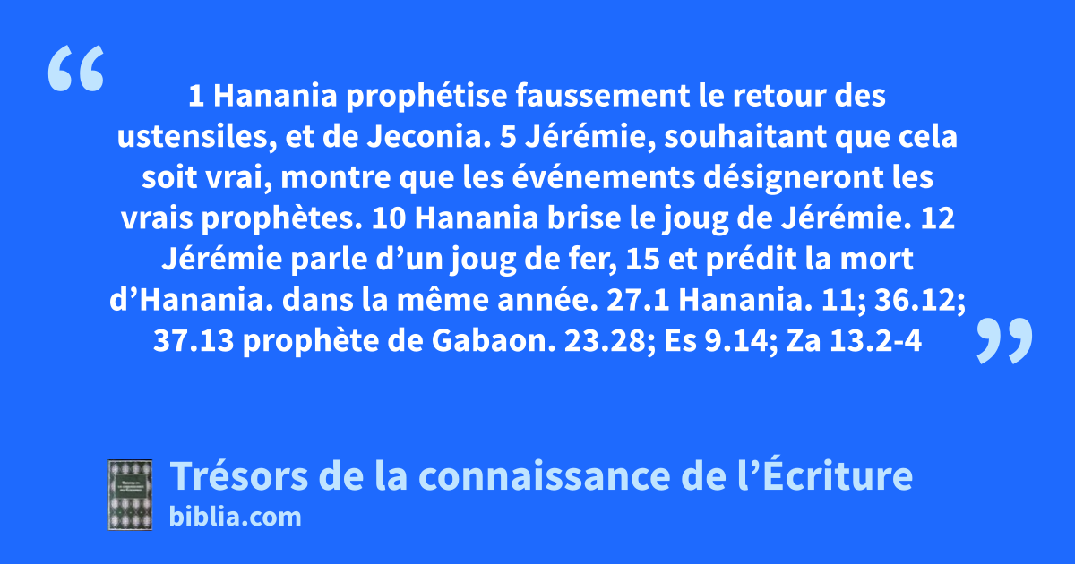 1 Hanania prophétise faussement le retour des ustensiles, et de Jeconia. 5 Jérémie, souhaitant que cela soit vrai, montre que les événements désigneront les vrais prophètes. 10 Hanania brise le joug de Jérémie. 12 Jérémie parle d’un joug de fer, 15 et prédit la mort d’Hanania.