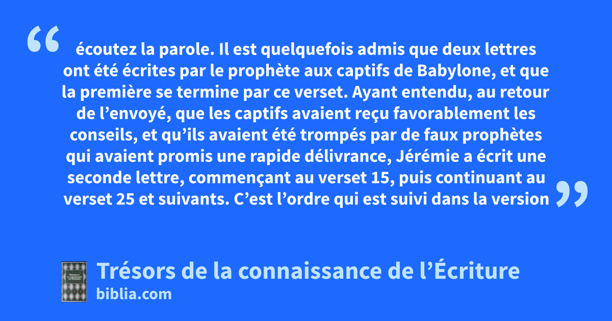 écoutez la parole. Il est quelquefois admis que deux lettres ont été écrites par le prophète aux captifs de Babylone, et que la première se termine par ce verset. Ayant entendu, au retour de l’envoyé, que les captifs avaient reçu favorablement les conseils, et qu’ils avaient été trompés par de faux prophètes qui avaient promis une rapide délivrance, Jérémie a écrit une seconde lettre, commençant au verset 15, puis continuant au verset 25 et suivants. C’est l’ordre qui est suivi dans la version « Septuagint » et on y trouve les jugements de Dieu sur Achab, Sédécias, et Schemaeja. vous tous. Ez 3.11, 15 que j’ai envoyés. 24.5; Mi 4.10