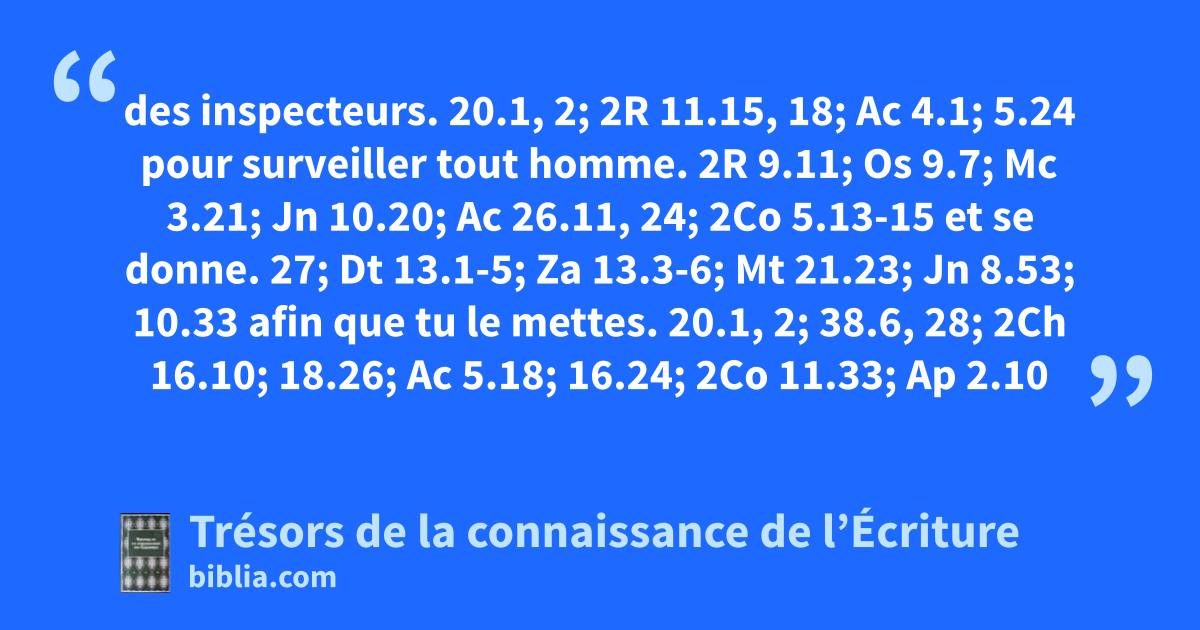 des inspecteurs. 20.1, 2; 2R 11.15, 18; Ac 4.1; 5.24 pour surveiller tout homme. 2R 9.11; Os 9.7; Mc 3.21; Jn 10.20; Ac 26.11, 24; 2Co 5.13-15 et se donne. 27; Dt 13.1-5; Za 13.3-6; Mt 21.23; Jn 8.53; 10.33 afin que tu le mettes. 20.1, 2; 38.6, 28; 2Ch 16.10; 18.26; Ac 5.18; 16.24; 2Co 11.33; Ap 2.10