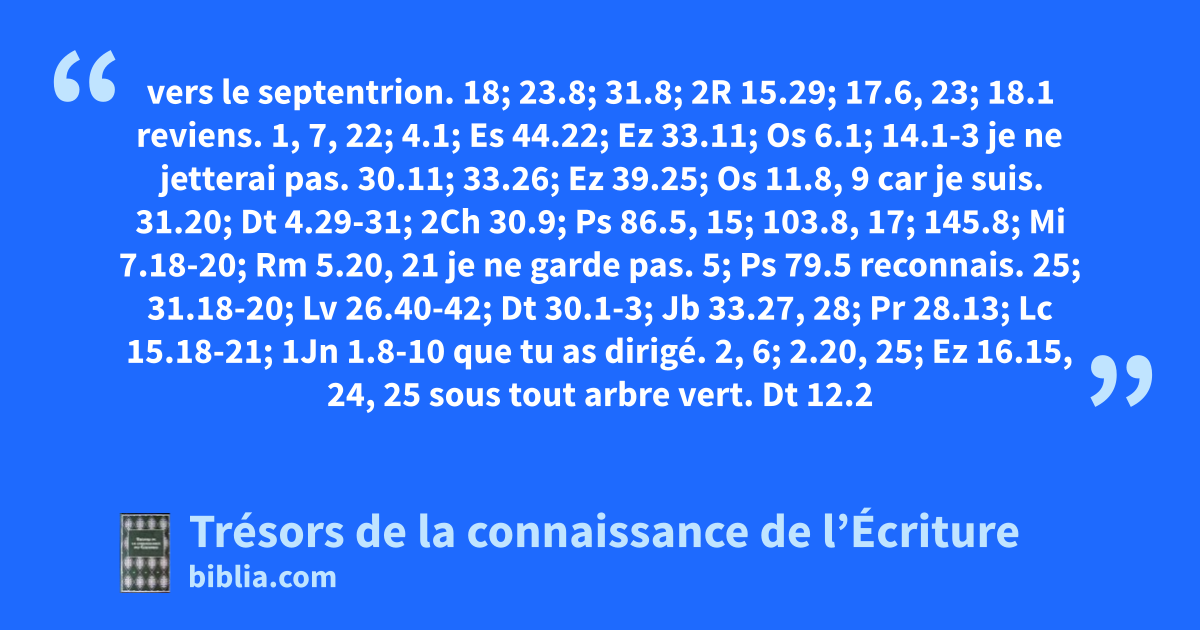 vers le septentrion. 18; 23.8; 31.8; 2R 15.29; 17.6, 23; 18.1 reviens. 1, 7, 22; 4.1; Es 44.22; Ez 33.11; Os 6.1; 14.1-3 je ne jetterai pas. 30.11; 33.26; Ez 39.25; Os 11.8, 9 car je suis. 31.20; Dt 4.29-31; 2Ch 30.9; Ps 86.5, 15; 103.8, 17; 145.8; Mi 7.18-20; Rm 5.20, 21 je ne garde pas. 5; Ps 79.5