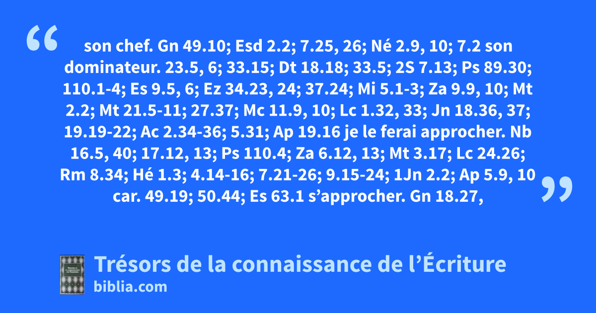 son chef. Gn 49.10; Esd 2.2; 7.25, 26; Né 2.9, 10; 7.2 son dominateur. 23.5, 6; 33.15; Dt 18.18; 33.5; 2S 7.13; Ps 89.30; 110.1-4; Es 9.5, 6; Ez 34.23, 24; 37.24; Mi 5.1-3; Za 9.9, 10; Mt 2.2; Mt 21.5-11; 27.37; Mc 11.9, 10; Lc 1.32, 33; Jn 18.36, 37; 19.19-22; Ac 2.34-36; 5.31; Ap 19.16 je le ferai approcher. Nb 16.5, 40; 17.12, 13; Ps 110.4; Za 6.12, 13; Mt 3.17; Lc 24.26; Rm 8.34; Hé 1.3; 4.14-16; 7.21-26; 9.15-24; 1Jn 2.2; Ap 5.9, 10 car. 49.19; 50.44; Es 63.1 s’approcher. Gn 18.27, 30, 32; Jb 23.3-5; 42.3-6; Hé 7.26; 9.24
