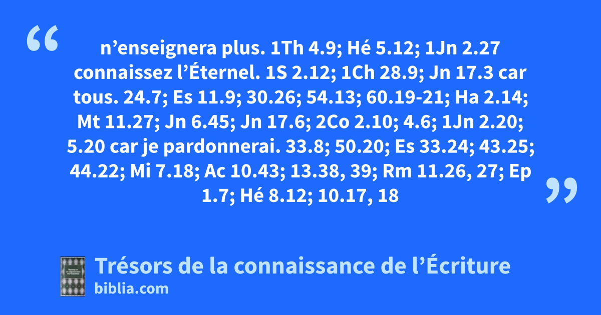 n’enseignera plus. 1Th 4.9; Hé 5.12; 1Jn 2.27 connaissez l’Éternel. 1S 2.12; 1Ch 28.9; Jn 17.3 car tous. 24.7; Es 11.9; 30.26; 54.13; 60.19-21; Ha 2.14; Mt 11.27; Jn 6.45; Jn 17.6; 2Co 2.10; 4.6; 1Jn 2.20; 5.20 car je pardonnerai. 33.8; 50.20; Es 33.24; 43.25; 44.22; Mi 7.18; Ac 10.43; 13.38, 39; Rm 11.26, 27; Ep 1.7; Hé 8.12; 10.17, 18