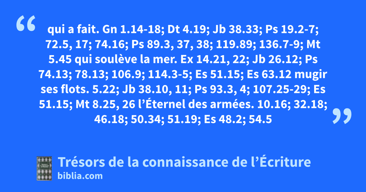 qui a fait. Gn 1.14-18; Dt 4.19; Jb 38.33; Ps 19.2-7; 72.5, 17; 74.16; Ps 89.3, 37, 38; 119.89; 136.7-9; Mt 5.45 qui soulève la mer. Ex 14.21, 22; Jb 26.12; Ps 74.13; 78.13; 106.9; 114.3-5; Es 51.15; Es 63.12 mugir ses flots. 5.22; Jb 38.10, 11; Ps 93.3, 4; 107.25-29; Es 51.15; Mt 8.25, 26 l’Éternel des armées. 10.16; 32.18; 46.18; 50.34; 51.19; Es 48.2; 54.5