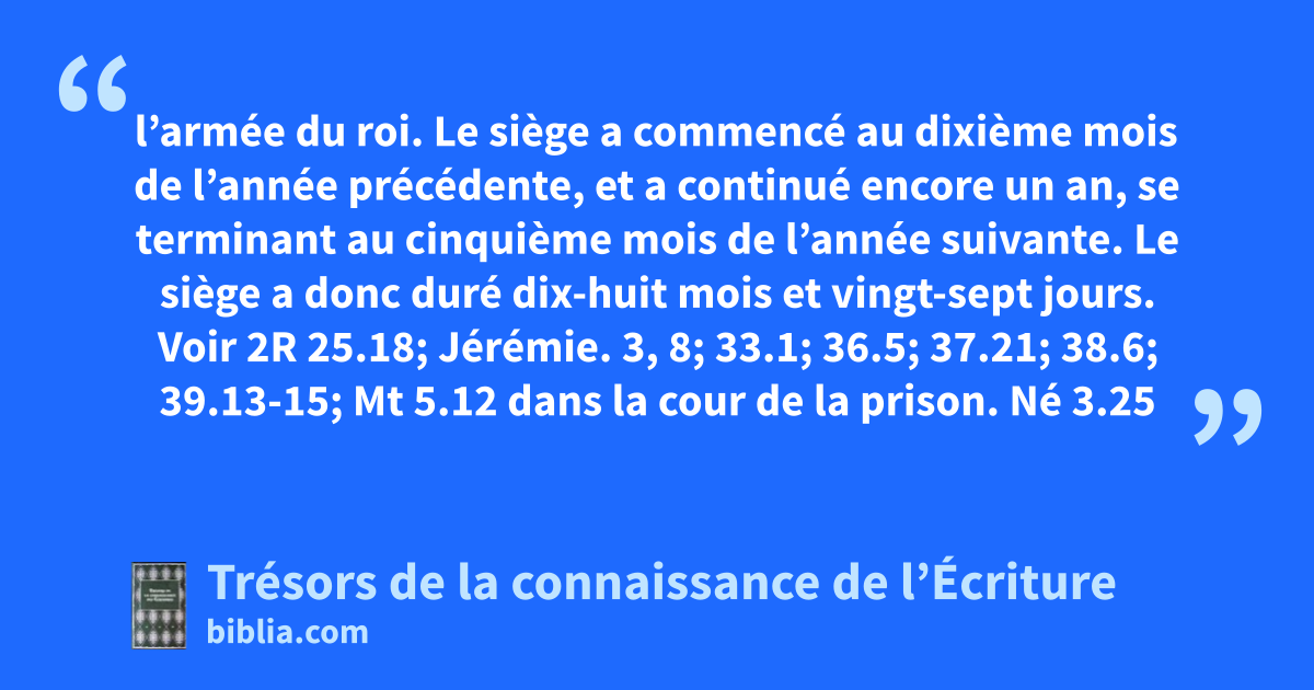 l’armée du roi. Le siège a commencé au dixième mois de l’année précédente, et a continué encore un an, se terminant au cinquième mois de l’année suivante. Le siège a donc duré dix-huit mois et vingt-sept jours. Voir 2R 25.18; Jérémie. 3, 8; 33.1; 36.5; 37.21; 38.6; 39.13-15; Mt 5.12 dans la cour de la prison. Né 3.25