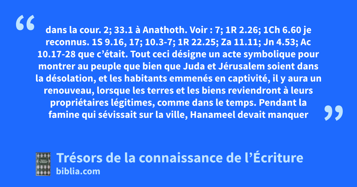 dans la cour. 2; 33.1 à Anathoth. Voir : 7; 1R 2.26; 1Ch 6.60 je reconnus. 1S 9.16, 17; 10.3-7; 1R 22.25; Za 11.11; Jn 4.53; Ac 10.17-28 que c’était. Tout ceci désigne un acte symbolique pour montrer au peuple que bien que Juda et Jérusalem soient dans la désolation, et les habitants emmenés en captivité, il y aura un renouveau, lorsque les terres et les biens reviendront à leurs propriétaires légitimes, comme dans le temps. Pendant la famine qui sévissait sur la ville, Hanameel devait manquer d’argent pour acheter du pain, et son champ ne devait pas avoir une très grande valeur dans de telles circonstances. Il est d’ailleurs stipulé qu’il a été payé 17 sicles d’argent.