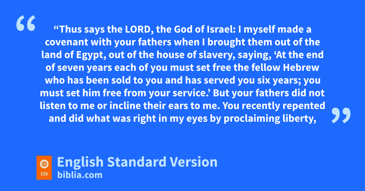 8 The word that came to Jeremiah from the Lord, after King Zedekiah phad made a covenant with all the people in Jerusalem qto make a proclamation of liberty to them, 9 rthat everyone should set free his Hebrew slaves, male and female, sso that no one should enslave a Jew, his brother. 10 And they obeyed, all the officials and all the people who had entered into the covenant that everyone would set free his slave, male or female, so that they would not be enslaved again. They obeyed and set them free. 11 But afterward they turned around and took back the male and female slaves rthey had set free, and brought them into subjection as slaves. 12 The word of the Lord came to Jeremiah from the Lord: 13 “Thus says the Lord, the God of Israel: I myself made a covenant with your fathers when tI brought them out of the land of Egypt, out of the house of slavery, saying, 14 u‘At the end of seven years each of you must set free the fellow Hebrew who has been sold to you and has served you six years; ryou must set him free from your service.’ But vyour fathers did not listen to me or incline their ears to me. 15 You recently repented and did what was right in my eyes qby proclaiming liberty, each to his neighbor, and wyou made a covenant before me in the xhouse that is called by my name, 16 but then you turned around yand profaned my name when each of you took back his male and female slaves, zwhom you had set free according to their desire, and you brought them into subjection to be your slaves.