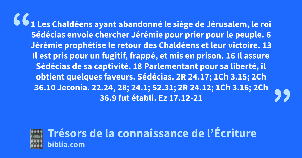 1 Les Chaldéens ayant abandonné le siège de Jérusalem, le roi Sédécias envoie chercher Jérémie pour prier pour le peuple. 6 Jérémie prophétise le retour des Chaldéens et leur victoire. 13 Il est pris pour un fugitif, frappé, et mis en prison. 16 Il assure Sédécias de sa captivité. 18 Parlementant pour sa liberté, il obtient quelques faveurs.