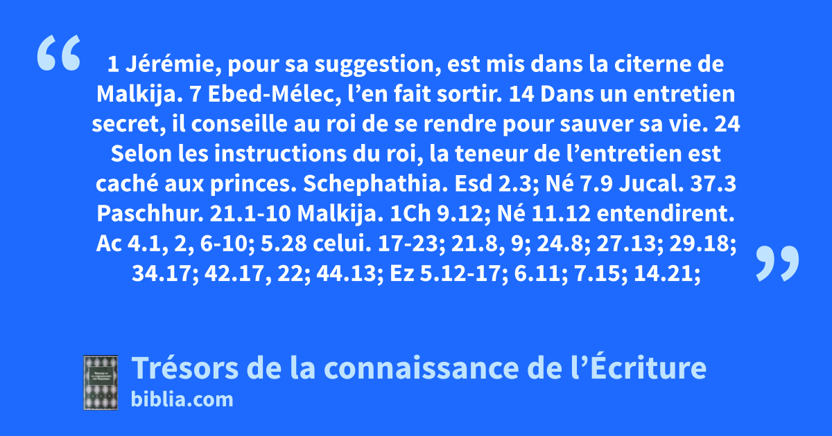 1 Jérémie, pour sa suggestion, est mis dans la citerne de Malkija. 7 Ebed-Mélec, l’en fait sortir. 14 Dans un entretien secret, il conseille au roi de se rendre pour sauver sa vie. 24 Selon les instructions du roi, la teneur de l’entretien est caché aux princes.