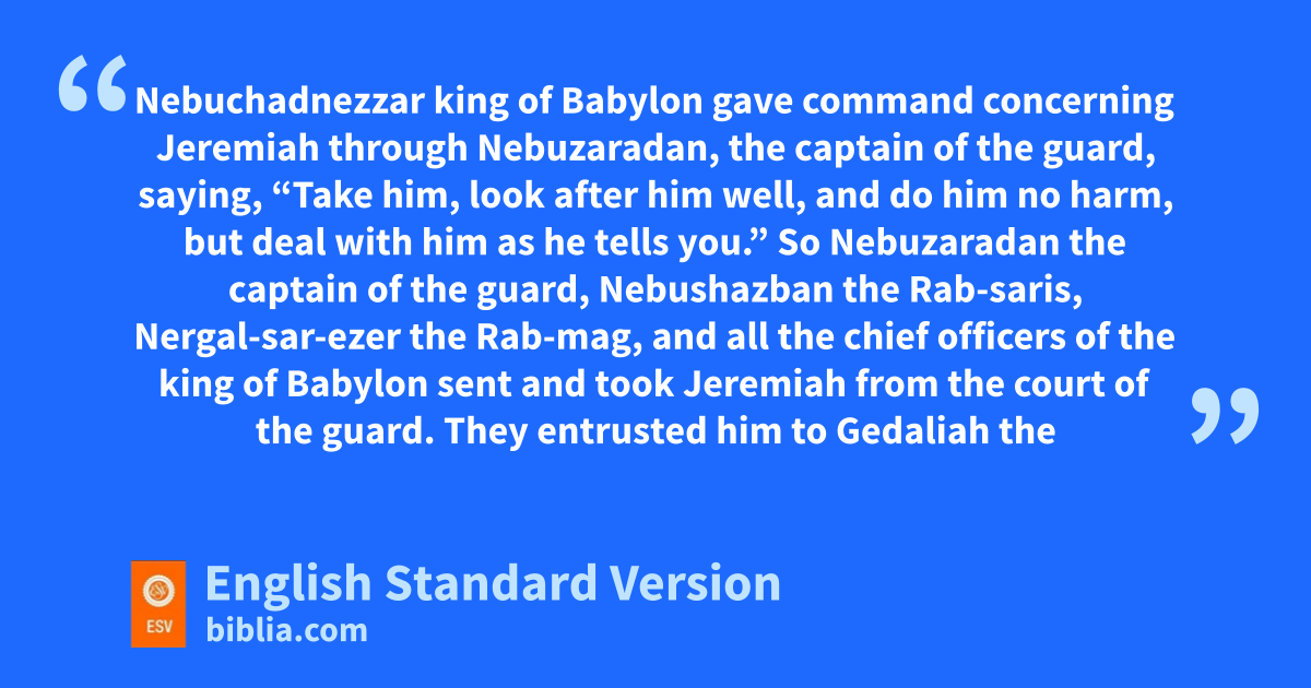 11 Nebuchadnezzar king of Babylon gave command concerning Jeremiah through Nebuzaradan, the captain of the guard, saying, 12 d“Take him, look after him well, and do him no harm, but deal with him as he tells you.” 13 So eNebuzaradan the captain of the guard, Nebushazban the Rab-saris, Nergal-sar-ezer the Rab-mag, eand all the chief officers of the king of Babylon 14 sent and took Jeremiah from fthe court of the guard. They entrusted him to gGedaliah the son of hAhikam, son of iShaphan, that he should take him home. So jhe lived among the people.