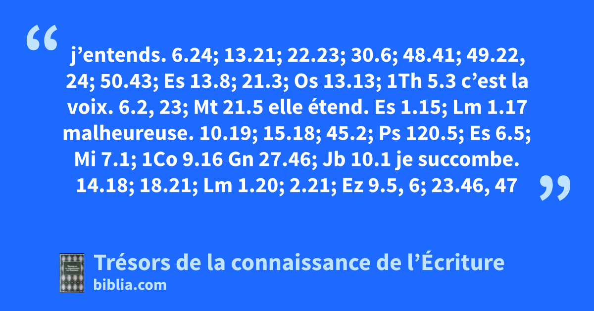 j’entends. 6.24; 13.21; 22.23; 30.6; 48.41; 49.22, 24; 50.43; Es 13.8; 21.3; Os 13.13; 1Th 5.3 c’est la voix. 6.2, 23; Mt 21.5 elle étend. Es 1.15; Lm 1.17 malheureuse. 10.19; 15.18; 45.2; Ps 120.5; Es 6.5; Mi 7.1; 1Co 9.16 Gn 27.46; Jb 10.1 je succombe. 14.18; 18.21; Lm 1.20; 2.21; Ez 9.5, 6; 23.46, 47