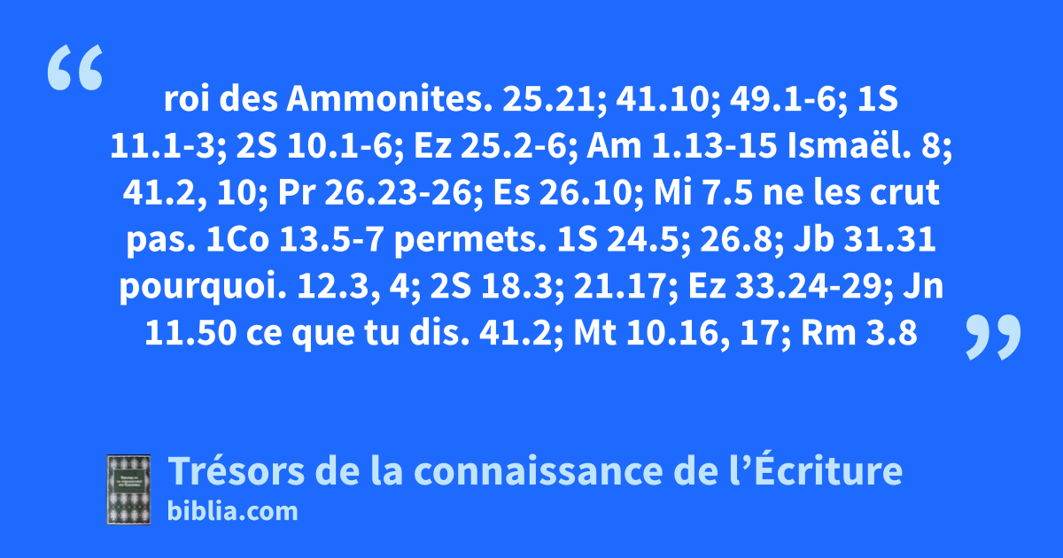 roi des Ammonites. 25.21; 41.10; 49.1-6; 1S 11.1-3; 2S 10.1-6; Ez 25.2-6; Am 1.13-15 Ismaël. 8; 41.2, 10; Pr 26.23-26; Es 26.10; Mi 7.5 ne les crut pas. 1Co 13.5-7