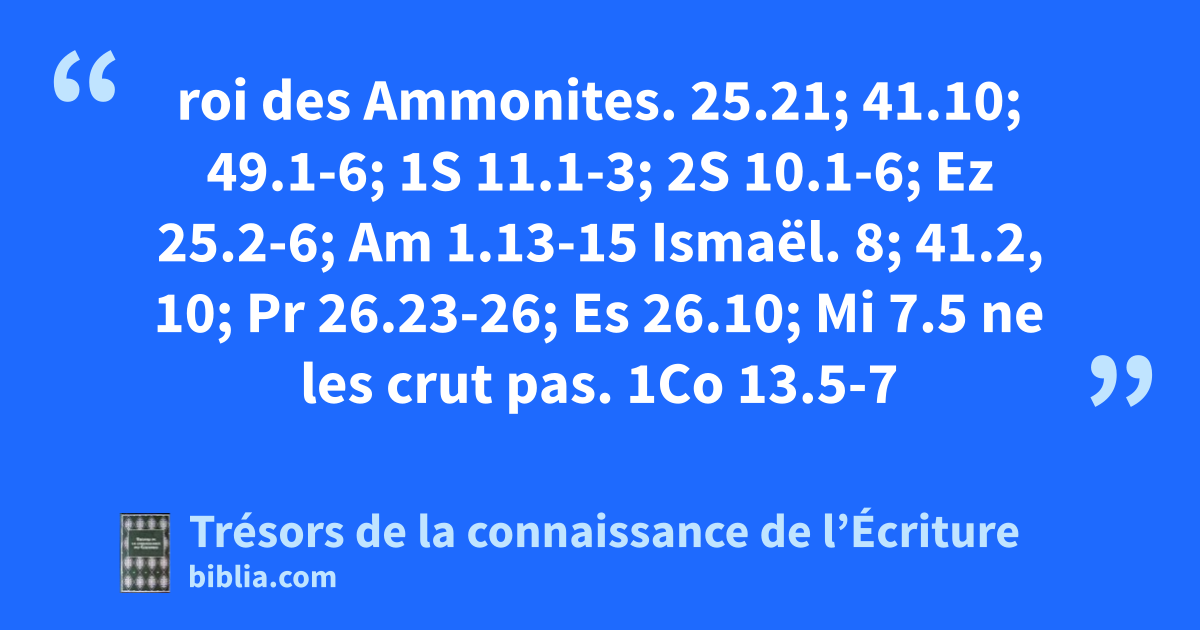 roi des Ammonites. 25.21; 41.10; 49.1-6; 1S 11.1-3; 2S 10.1-6; Ez 25.2-6; Am 1.13-15 Ismaël. 8; 41.2, 10; Pr 26.23-26; Es 26.10; Mi 7.5 ne les crut pas. 1Co 13.5-7
