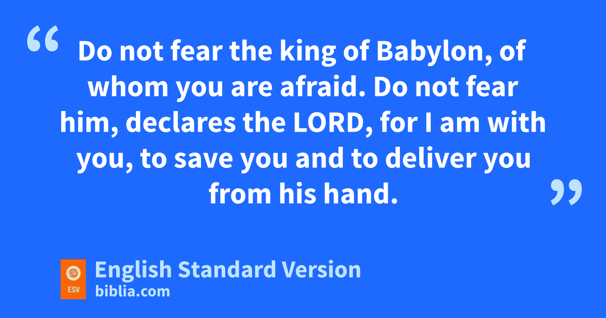 7 nAt the end of ten days the word of the Lord came to Jeremiah. 8 Then he summoned zJohanan the son of Kareah and yall the commanders of the forces who were with him, and all the people bfrom the least to the greatest, 9 and said to them, “Thus says the Lord, the God of Israel, oto whom you sent me to present your plea for mercy before him: 10 If you will remain in this land, pthen I will build you up and not pull you down; I will plant you, and not pluck you up; qfor I relent of the disaster that I did to you. 11 rDo not fear the king of Babylon, rof whom you are afraid. sDo not fear him, declares the Lord, sfor I am with you, to save you and to deliver you from his hand. 12 tI will grant you mercy, that he may have mercy on you and let you remain in your own land. 13 uBut if you say, ‘We will not remain in this land,’ disobeying the voice of the Lord your God 14 and saying, ‘No, vwe will go to the land of Egypt, where we shall not see war or whear the sound of the trumpet or xbe hungry for bread, and we will dwell there,’ 15 then hear the word of the Lord, O remnant of Judah. Thus says the Lord of hosts, the God of Israel: yIf you set your faces to enter Egypt zand go to live there, 16 then the sword athat you fear shall overtake you there in the land of Egypt, and the famine of which you are afraid shall follow close after you to Egypt, band there you shall die. 17 All the men who set their faces to go to Egypt to live there shall die by the sword, by famine, and by pestilence. They shall have cno remnant or survivor from the disaster that I will bring upon them.