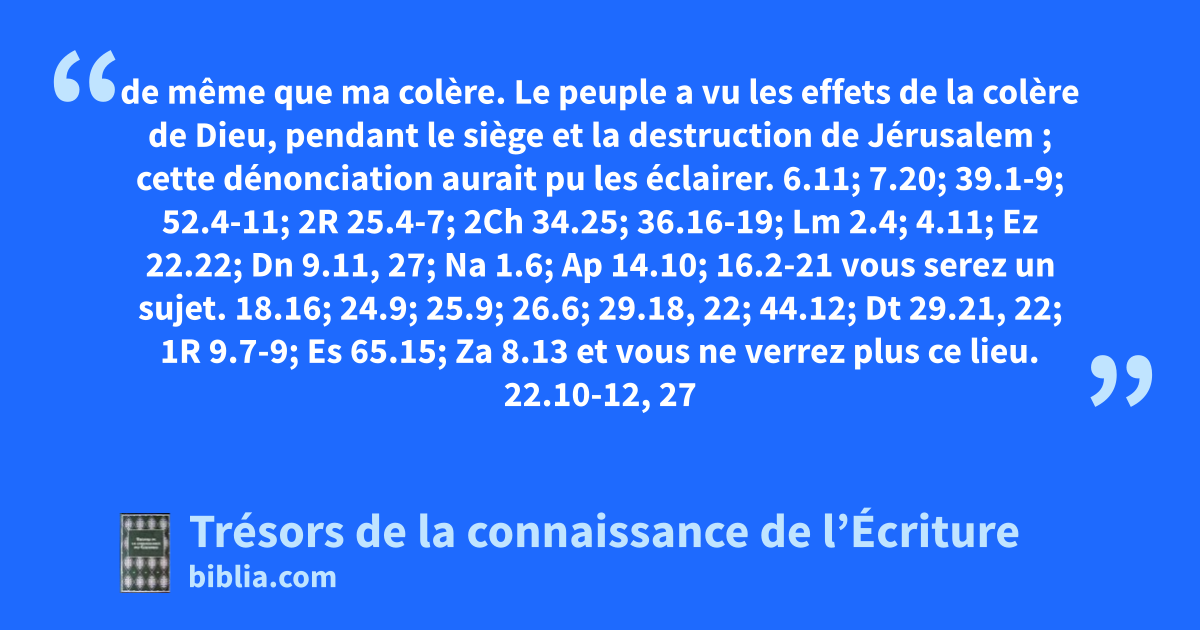 de même que ma colère. Le peuple a vu les effets de la colère de Dieu, pendant le siège et la destruction de Jérusalem ; cette dénonciation aurait pu les éclairer. 6.11; 7.20; 39.1-9; 52.4-11; 2R 25.4-7; 2Ch 34.25; 36.16-19; Lm 2.4; 4.11; Ez 22.22; Dn 9.11, 27; Na 1.6; Ap 14.10; 16.2-21 vous serez un sujet. 18.16; 24.9; 25.9; 26.6; 29.18, 22; 44.12; Dt 29.21, 22; 1R 9.7-9; Es 65.15; Za 8.13 et vous ne verrez plus ce lieu. 22.10-12, 27