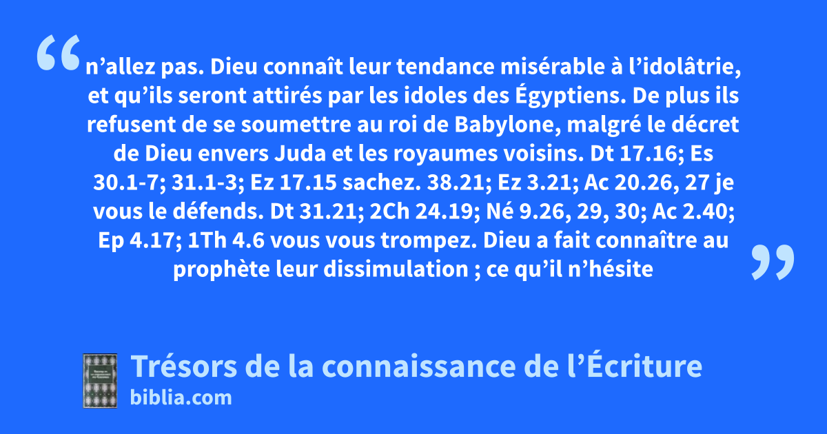n’allez pas. Dieu connaît leur tendance misérable à l’idolâtrie, et qu’ils seront attirés par les idoles des Égyptiens. De plus ils refusent de se soumettre au roi de Babylone, malgré le décret de Dieu envers Juda et les royaumes voisins. Dt 17.16; Es 30.1-7; 31.1-3; Ez 17.15 sachez. 38.21; Ez 3.21; Ac 20.26, 27 je vous le défends. Dt 31.21; 2Ch 24.19; Né 9.26, 29, 30; Ac 2.40; Ep 4.17; 1Th 4.6
