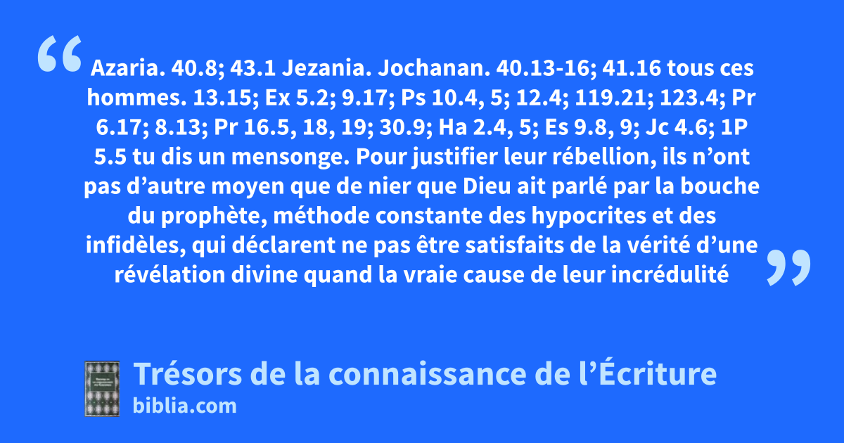 Azaria. 40.8; 43.1 Jezania. Jochanan. 40.13-16; 41.16 tous ces hommes. 13.15; Ex 5.2; 9.17; Ps 10.4, 5; 12.4; 119.21; 123.4; Pr 6.17; 8.13; Pr 16.5, 18, 19; 30.9; Ha 2.4, 5; Es 9.8, 9; Jc 4.6; 1P 5.5 tu dis un mensonge. Pour justifier leur rébellion, ils n’ont pas d’autre moyen que de nier que Dieu ait parlé par la bouche du prophète, méthode constante des hypocrites et des infidèles, qui déclarent ne pas être satisfaits de la vérité d’une révélation divine quand la vraie cause de leur incrédulité est que les ordres de Dieu contredisent leurs appétits. 5.12, 13; 2Ch 36.13; Es 7.9