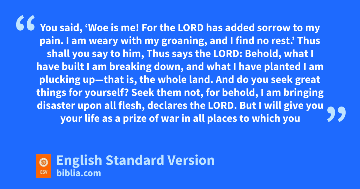 45 The word that Jeremiah the prophet spoke to sBaruch the son of Neriah, twhen he wrote these words in a book at the dictation of Jeremiah, uin the fourth year of Jehoiakim the son of Josiah, king of Judah: 2 “Thus says the Lord, the God of Israel, to you, O Baruch: 3 You said, v‘Woe is me! For the Lord has added sorrow to my pain. wI am weary with my groaning, xand I find no rest.’ 4 Thus shall you say to him, Thus says the Lord: yBehold, what I have built I am breaking down, and what I have planted I am plucking up—that is, the whole land. 5 And zdo you seek great things for yourself? Seek them not, for behold, aI am bringing disaster upon all flesh, declares the Lord. But I will give you byour life as a prize of war in all places to which you may go.”