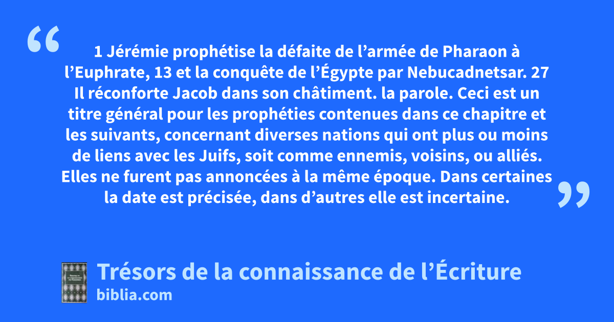 1 Jérémie prophétise la défaite de l’armée de Pharaon à l’Euphrate, 13 et la conquête de l’Égypte par Nebucadnetsar. 27 Il réconforte Jacob dans son châtiment.