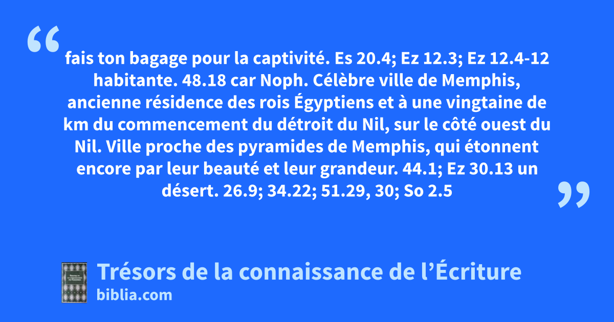 fais ton bagage pour la captivité. Es 20.4; Ez 12.3; Ez 12.4-12 habitante. 48.18 car Noph. Célèbre ville de Memphis, ancienne résidence des rois Égyptiens et à une vingtaine de km du commencement du détroit du Nil, sur le côté ouest du Nil. Ville proche des pyramides de Memphis, qui étonnent encore par leur beauté et leur grandeur. 44.1; Ez 30.13 un désert. 26.9; 34.22; 51.29, 30; So 2.5
