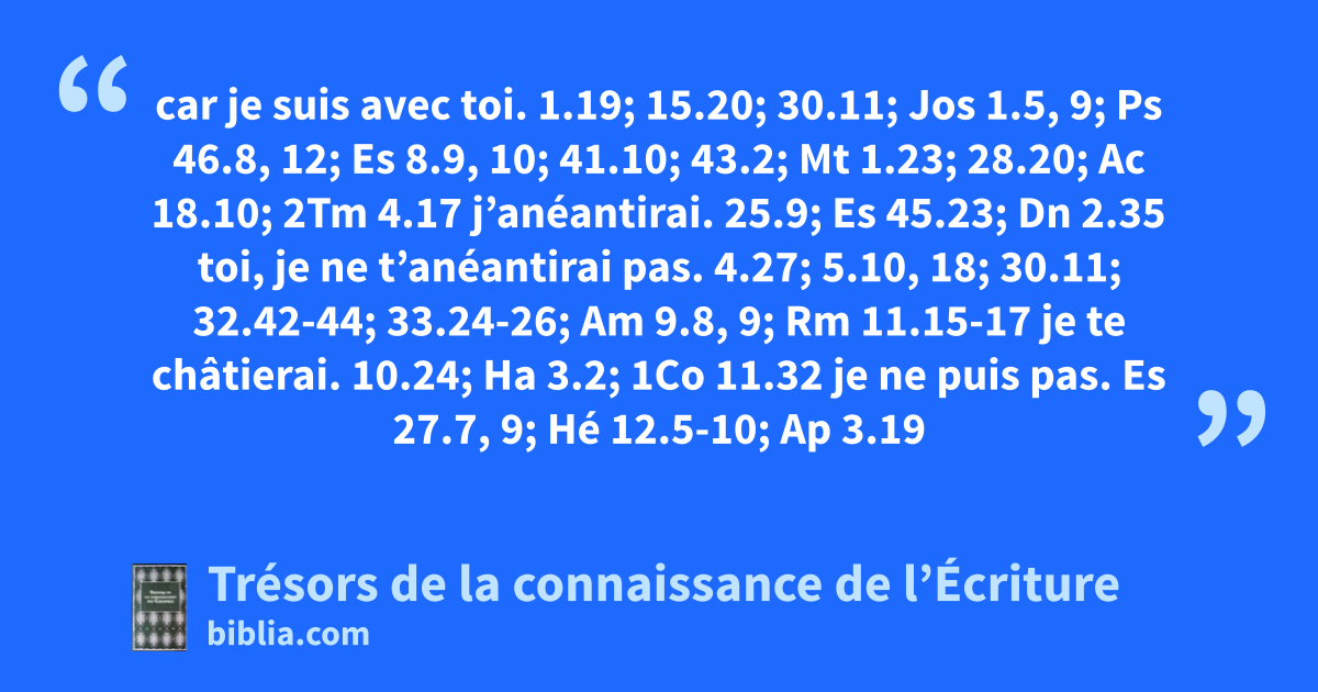 car je suis avec toi. 1.19; 15.20; 30.11; Jos 1.5, 9; Ps 46.8, 12; Es 8.9, 10; 41.10; 43.2; Mt 1.23; 28.20; Ac 18.10; 2Tm 4.17 j’anéantirai. 25.9; Es 45.23; Dn 2.35 toi, je ne t’anéantirai pas. 4.27; 5.10, 18; 30.11; 32.42-44; 33.24-26; Am 9.8, 9; Rm 11.15-17 je te châtierai. 10.24; Ha 3.2; 1Co 11.32 je ne puis pas. Es 27.7, 9; Hé 12.5-10; Ap 3.19