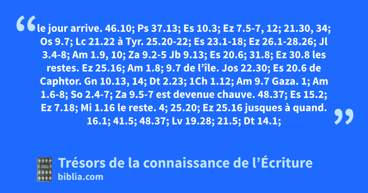 le jour arrive. 46.10; Ps 37.13; Es 10.3; Ez 7.5-7, 12; 21.30, 34; Os 9.7; Lc 21.22 à Tyr. 25.20-22; Es 23.1-18; Ez 26.1-28.26; Jl 3.4-8; Am 1.9, 10; Za 9.2-5 Jb 9.13; Es 20.6; 31.8; Ez 30.8 les restes. Ez 25.16; Am 1.8; 9.7 de l’île. Jos 22.30; Es 20.6 de Caphtor. Gn 10.13, 14; Dt 2.23; 1Ch 1.12; Am 9.7