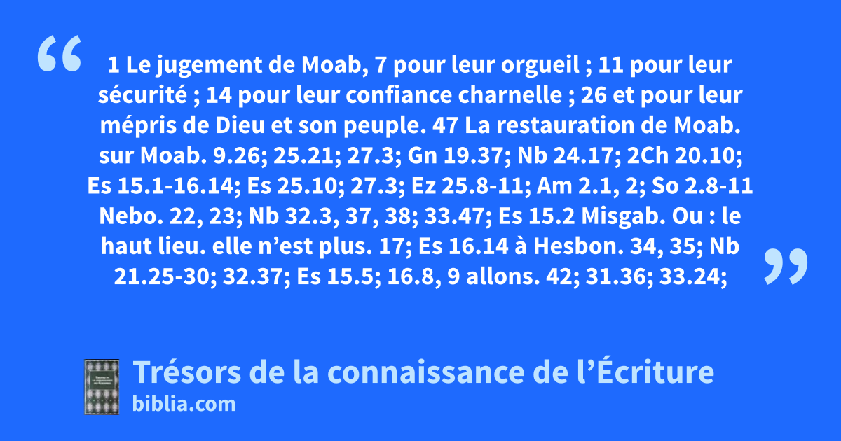 1 Le jugement de Moab, 7 pour leur orgueil ; 11 pour leur sécurité ; 14 pour leur confiance charnelle ; 26 et pour leur mépris de Dieu et son peuple. 47 La restauration de Moab.