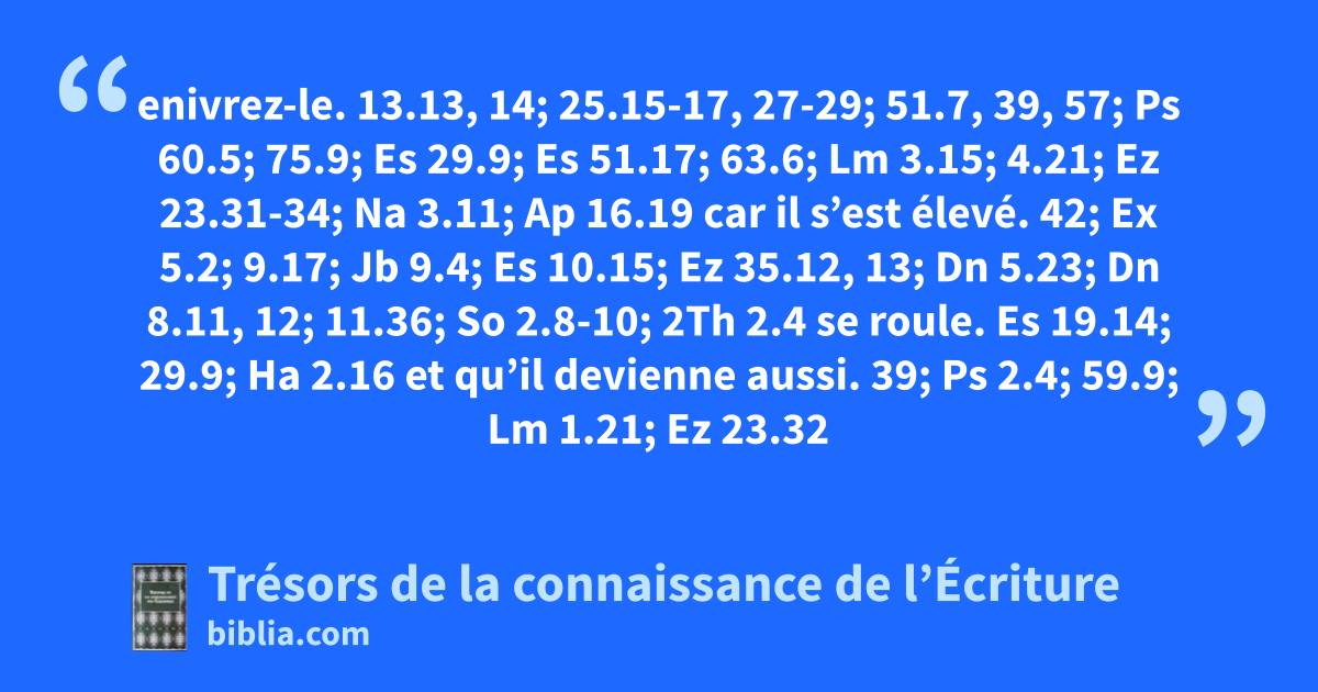 enivrez-le. 13.13, 14; 25.15-17, 27-29; 51.7, 39, 57; Ps 60.5; 75.9; Es 29.9; Es 51.17; 63.6; Lm 3.15; 4.21; Ez 23.31-34; Na 3.11; Ap 16.19 car il s’est élevé. 42; Ex 5.2; 9.17; Jb 9.4; Es 10.15; Ez 35.12, 13; Dn 5.23; Dn 8.11, 12; 11.36; So 2.8-10; 2Th 2.4 se roule. Es 19.14; 29.9; Ha 2.16 et qu’il devienne aussi. 39; Ps 2.4; 59.9; Lm 1.21; Ez 23.32