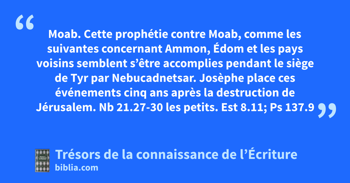 Moab. Cette prophétie contre Moab, comme les suivantes concernant Ammon, Édom et les pays voisins semblent s’être accomplies pendant le siège de Tyr par Nebucadnetsar. Josèphe place ces événements cinq ans après la destruction de Jérusalem. Nb 21.27-30 les petits. Est 8.11; Ps 137.9