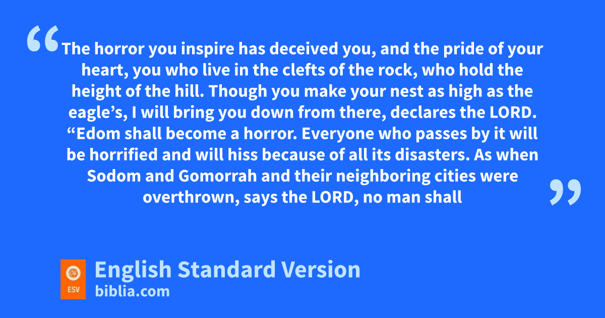 17 h“Edom shall become a horror. iEveryone who passes by it will be horrified iand will hiss because of all its disasters. 18 jAs when Sodom and Gomorrah and their kneighboring cities were overthrown, says the Lord, lno man shall dwell there, lno man shall sojourn in her. 19 mBehold, nlike a lion coming up from othe jungle of the Jordan against a perennial pasture, I will suddenly make him4 run away from her. And I will appoint over her whomever I choose. pFor who is like me? qWho will summon me? rWhat shepherd can stand before me? 20 Therefore hear the plan that the Lord has made against sEdom and the purposes that he has formed against the inhabitants of tTeman: uEven the little ones of the flock shall be dragged away. Surely their fold shall be appalled at their fate. 21 At the sound of their fall vthe earth shall tremble; the sound of their cry shall be heard at the Red Sea. 22 Behold, wone shall mount up and fly swiftly like an eagle and spread his wings against xBozrah, and the heart of the warriors of Edom shall be in that day like the heart yof a woman in her birth pains.”