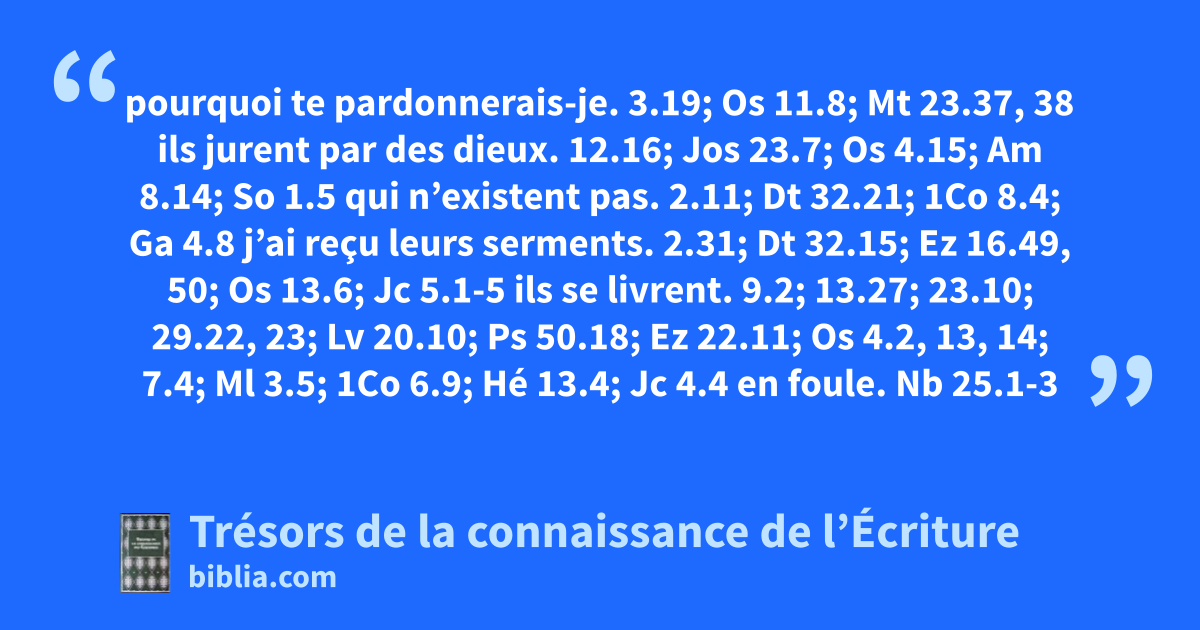 pourquoi te pardonnerais-je. 3.19; Os 11.8; Mt 23.37, 38 ils jurent par des dieux. 12.16; Jos 23.7; Os 4.15; Am 8.14; So 1.5 qui n’existent pas. 2.11; Dt 32.21; 1Co 8.4; Ga 4.8 j’ai reçu leurs serments. 2.31; Dt 32.15; Ez 16.49, 50; Os 13.6; Jc 5.1-5 ils se livrent. 9.2; 13.27; 23.10; 29.22, 23; Lv 20.10; Ps 50.18; Ez 22.11; Os 4.2, 13, 14; 7.4; Ml 3.5; 1Co 6.9; Hé 13.4; Jc 4.4 en foule. Nb 25.1-3