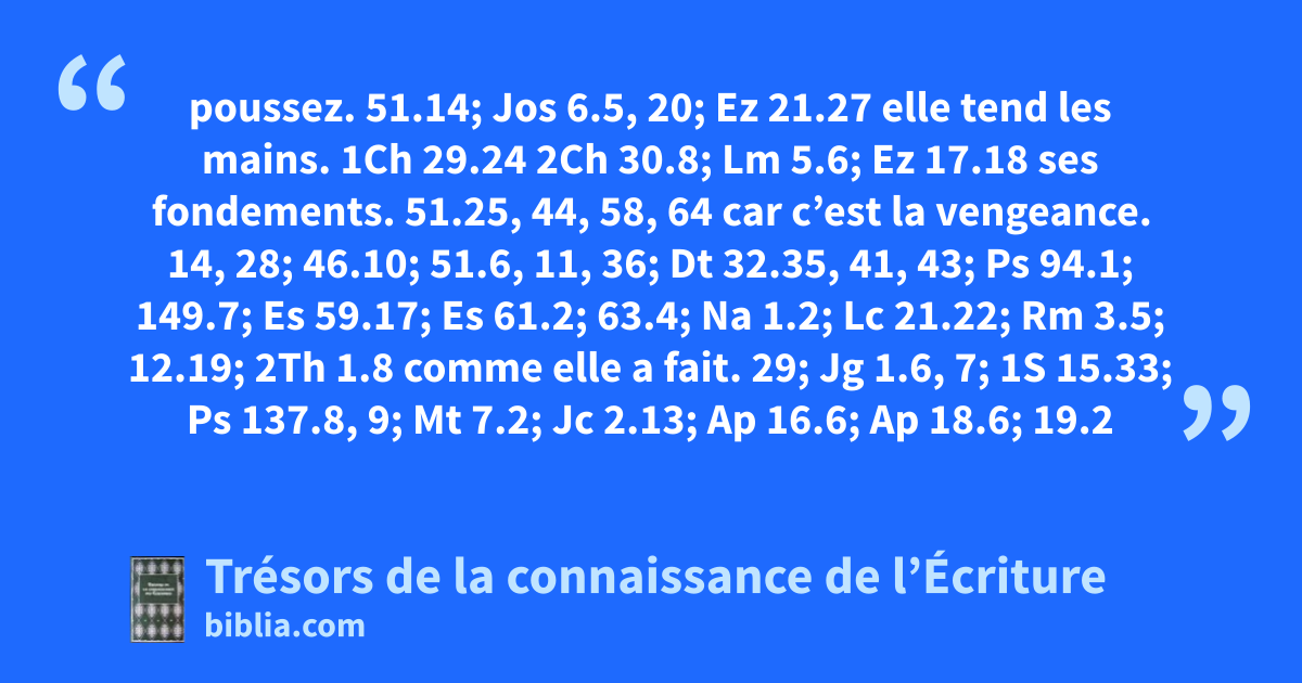 poussez. 51.14; Jos 6.5, 20; Ez 21.27 elle tend les mains. 1Ch 29.24 2Ch 30.8; Lm 5.6; Ez 17.18 ses fondements. 51.25, 44, 58, 64 car c’est la vengeance. 14, 28; 46.10; 51.6, 11, 36; Dt 32.35, 41, 43; Ps 94.1; 149.7; Es 59.17; Es 61.2; 63.4; Na 1.2; Lc 21.22; Rm 3.5; 12.19; 2Th 1.8 comme elle a fait. 29; Jg 1.6, 7; 1S 15.33; Ps 137.8, 9; Mt 7.2; Jc 2.13; Ap 16.6; Ap 18.6; 19.2