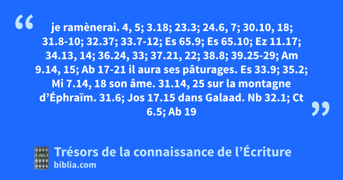 je ramènerai. 4, 5; 3.18; 23.3; 24.6, 7; 30.10, 18; 31.8-10; 32.37; 33.7-12; Es 65.9; Es 65.10; Ez 11.17; 34.13, 14; 36.24, 33; 37.21, 22; 38.8; 39.25-29; Am 9.14, 15; Ab 17-21 il aura ses pâturages. Es 33.9; 35.2; Mi 7.14, 18 son âme. 31.14, 25 sur la montagne d’Éphraïm. 31.6; Jos 17.15 dans Galaad. Nb 32.1; Ct 6.5; Ab 19