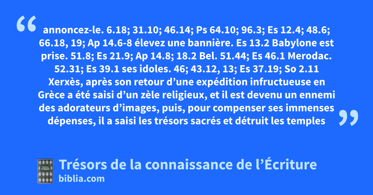 annoncez-le. 6.18; 31.10; 46.14; Ps 64.10; 96.3; Es 12.4; 48.6; 66.18, 19; Ap 14.6-8 élevez une bannière. Es 13.2 Babylone est prise. 51.8; Es 21.9; Ap 14.8; 18.2 Bel. 51.44; Es 46.1 Merodac. 52.31; Es 39.1 ses idoles. 46; 43.12, 13; Es 37.19; So 2.11 Xerxès, après son retour d’une expédition infructueuse en Grèce a été saisi d’un zèle religieux, et il est devenu un ennemi des adorateurs d’images, puis, pour compenser ses immenses dépenses, il a saisi les trésors sacrés et détruit les temples et idoles de Babylone, accomplissant ainsi la prophétie d’Ésaïe et de Jérémie. Es 21.9; 46.1; Jr 50.2; 51.44, 47, 52