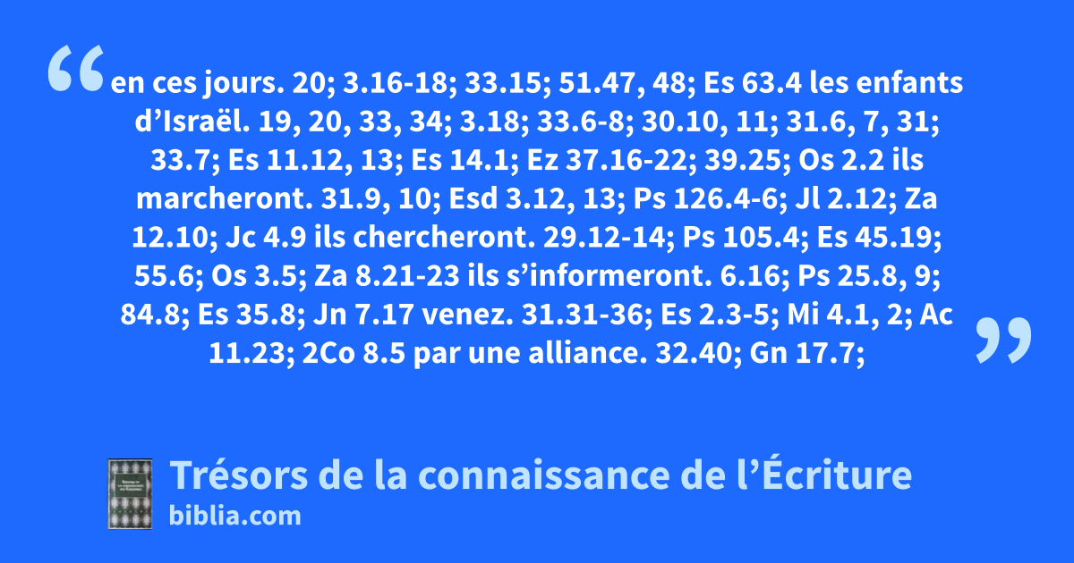 en ces jours. 20; 3.16-18; 33.15; 51.47, 48; Es 63.4 les enfants d’Israël. 19, 20, 33, 34; 3.18; 33.6-8; 30.10, 11; 31.6, 7, 31; 33.7; Es 11.12, 13; Es 14.1; Ez 37.16-22; 39.25; Os 2.2 ils marcheront. 31.9, 10; Esd 3.12, 13; Ps 126.4-6; Jl 2.12; Za 12.10; Jc 4.9 ils chercheront. 29.12-14; Ps 105.4; Es 45.19; 55.6; Os 3.5; Za 8.21-23