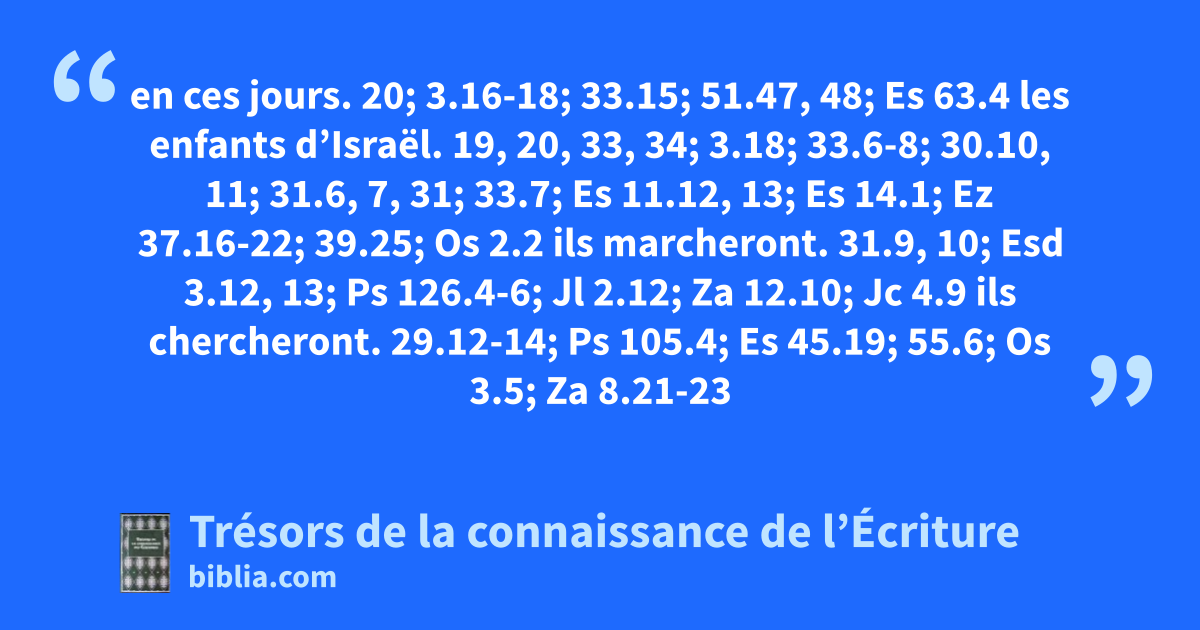 en ces jours. 20; 3.16-18; 33.15; 51.47, 48; Es 63.4 les enfants d’Israël. 19, 20, 33, 34; 3.18; 33.6-8; 30.10, 11; 31.6, 7, 31; 33.7; Es 11.12, 13; Es 14.1; Ez 37.16-22; 39.25; Os 2.2 ils marcheront. 31.9, 10; Esd 3.12, 13; Ps 126.4-6; Jl 2.12; Za 12.10; Jc 4.9 ils chercheront. 29.12-14; Ps 105.4; Es 45.19; 55.6; Os 3.5; Za 8.21-23