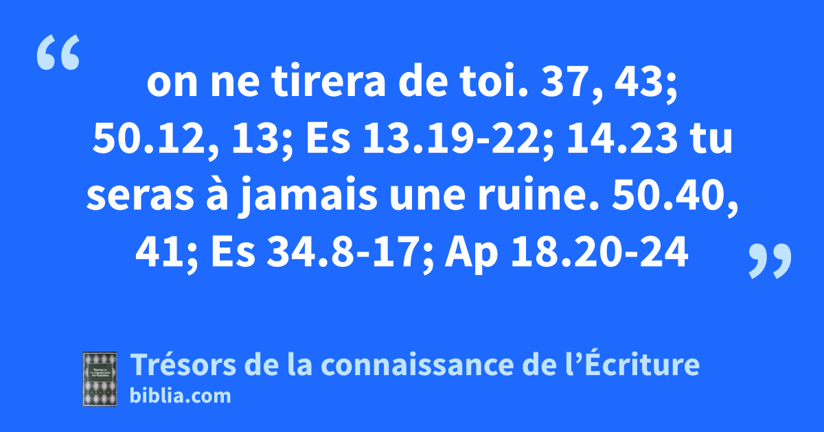 on ne tirera de toi. 37, 43; 50.12, 13; Es 13.19-22; 14.23 tu seras à jamais une ruine. 50.40, 41; Es 34.8-17; Ap 18.20-24