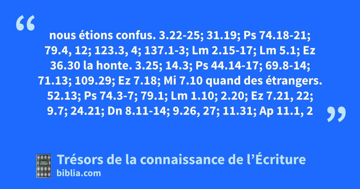 nous étions confus. 3.22-25; 31.19; Ps 74.18-21; 79.4, 12; 123.3, 4; 137.1-3; Lm 2.15-17; Lm 5.1; Ez 36.30 la honte. 3.25; 14.3; Ps 44.14-17; 69.8-14; 71.13; 109.29; Ez 7.18; Mi 7.10 quand des étrangers. 52.13; Ps 74.3-7; 79.1; Lm 1.10; 2.20; Ez 7.21, 22; 9.7; 24.21; Dn 8.11-14; 9.26, 27; 11.31; Ap 11.1, 2