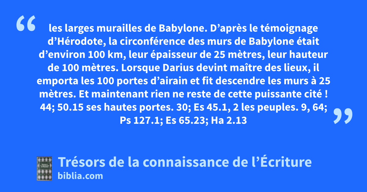 les larges murailles de Babylone. D’après le témoignage d’Hérodote, la circonférence des murs de Babylone était d’environ 100 km, leur épaisseur de 25 mètres, leur hauteur de 100 mètres. Lorsque Darius devint maître des lieux, il emporta les 100 portes d’airain et fit descendre les murs à 25 mètres. Et maintenant rien ne reste de cette puissante cité ! 44; 50.15 ses hautes portes. 30; Es 45.1, 2 les peuples. 9, 64; Ps 127.1; Es 65.23; Ha 2.13