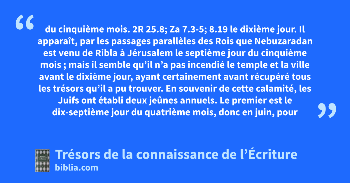 du cinquième mois. 2R 25.8; Za 7.3-5; 8.19 le dixième jour. Il apparaît, par les passages parallèles des Rois que Nebuzaradan est venu de Ribla à Jérusalem le septième jour du cinquième mois ; mais il semble qu’il n’a pas incendié le temple et la ville avant le dixième jour, ayant certainement avant récupéré tous les trésors qu’il a pu trouver. En souvenir de cette calamité, les Juifs ont établi deux jeûnes annuels. Le premier est le dix-septième jour du quatrième mois, donc en juin, pour la destruction de Jérusalem, et l’autre le neuvième jour du cinquième mois, en juillet, pour la destruction du temple. la dix neuvième année. 29; 2R 24.12; 25.8 chef des gardes. 14; 39.9; Gn 37.36 *