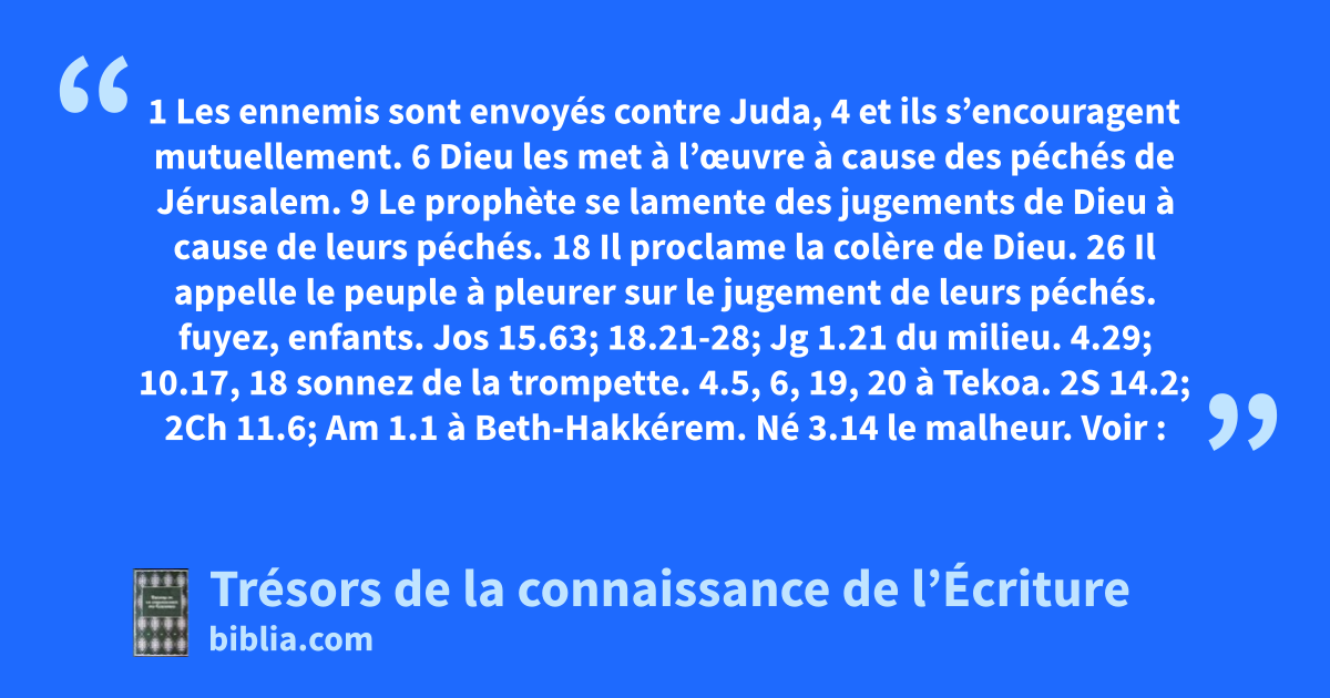 fuyez, enfants. Jos 15.63; 18.21-28; Jg 1.21 du milieu. 4.29; 10.17, 18 sonnez de la trompette. 4.5, 6, 19, 20 à Tekoa. 2S 14.2; 2Ch 11.6; Am 1.1 à Beth-Hakkérem. Né 3.14 le malheur. Voir : 22; 1.14, 15; 4.6; 10.22; 25.9; Ez 26.7-21