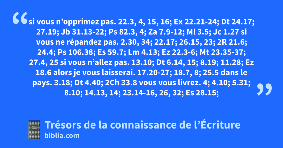 si vous n’opprimez pas. 22.3, 4, 15, 16; Ex 22.21-24; Dt 24.17; 27.19; Jb 31.13-22; Ps 82.3, 4; Za 7.9-12; Ml 3.5; Jc 1.27 si vous ne répandez pas. 2.30, 34; 22.17; 26.15, 23; 2R 21.6; 24.4; Ps 106.38; Es 59.7; Lm 4.13; Ez 22.3-6; Mt 23.35-37; 27.4, 25 si vous n’allez pas. 13.10; Dt 6.14, 15; 8.19; 11.28; Ez 18.6