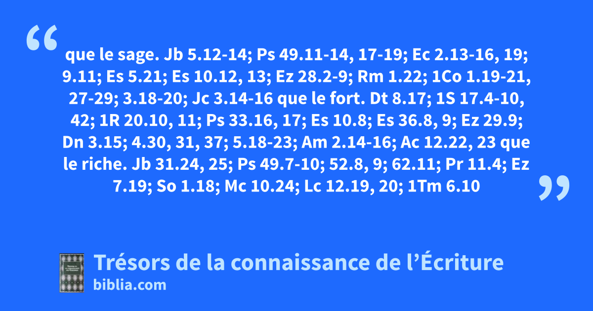 que le sage. Jb 5.12-14; Ps 49.11-14, 17-19; Ec 2.13-16, 19; 9.11; Es 5.21; Es 10.12, 13; Ez 28.2-9; Rm 1.22; 1Co 1.19-21, 27-29; 3.18-20; Jc 3.14-16 que le fort. Dt 8.17; 1S 17.4-10, 42; 1R 20.10, 11; Ps 33.16, 17; Es 10.8; Es 36.8, 9; Ez 29.9; Dn 3.15; 4.30, 31, 37; 5.18-23; Am 2.14-16; Ac 12.22, 23 que le riche. Jb 31.24, 25; Ps 49.7-10; 52.8, 9; 62.11; Pr 11.4; Ez 7.19; So 1.18; Mc 10.24; Lc 12.19, 20; 1Tm 6.10