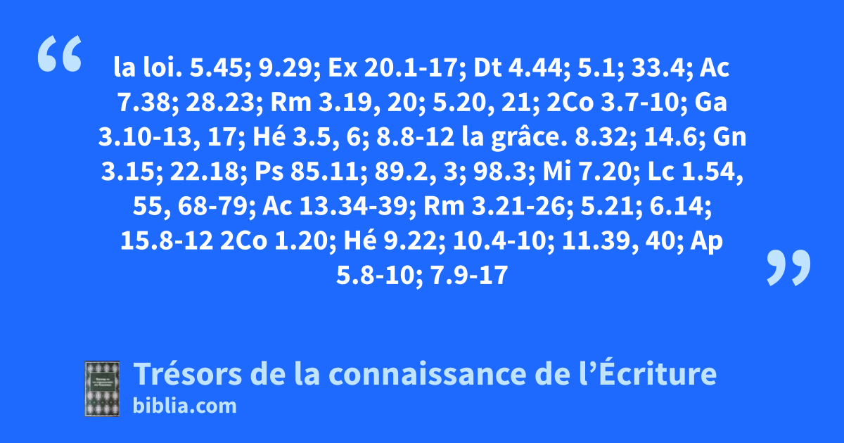 la loi. 5.45; 9.29; Ex 20.1-17; Dt 4.44; 5.1; 33.4; Ac 7.38; 28.23; Rm 3.19, 20; 5.20, 21; 2Co 3.7-10; Ga 3.10-13, 17; Hé 3.5, 6; 8.8-12 la grâce. 8.32; 14.6; Gn 3.15; 22.18; Ps 85.11; 89.2, 3; 98.3; Mi 7.20; Lc 1.54, 55, 68-79; Ac 13.34-39; Rm 3.21-26; 5.21; 6.14; 15.8-12 2Co 1.20; Hé 9.22; 10.4-10; 11.39, 40; Ap 5.8-10; 7.9-17