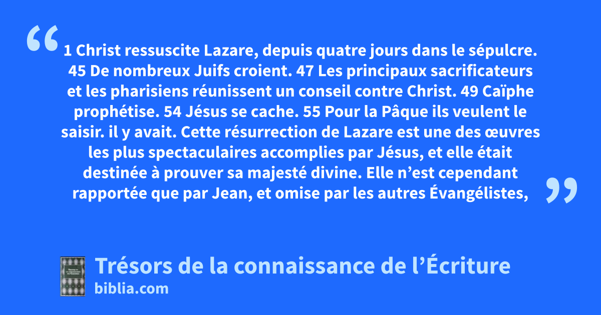 1 Christ ressuscite Lazare, depuis quatre jours dans le sépulcre. 45 De nombreux Juifs croient. 47 Les principaux sacrificateurs et les pharisiens réunissent un conseil contre Christ. 49 Caïphe prophétise. 54 Jésus se cache. 55 Pour la Pâque ils veulent le saisir.